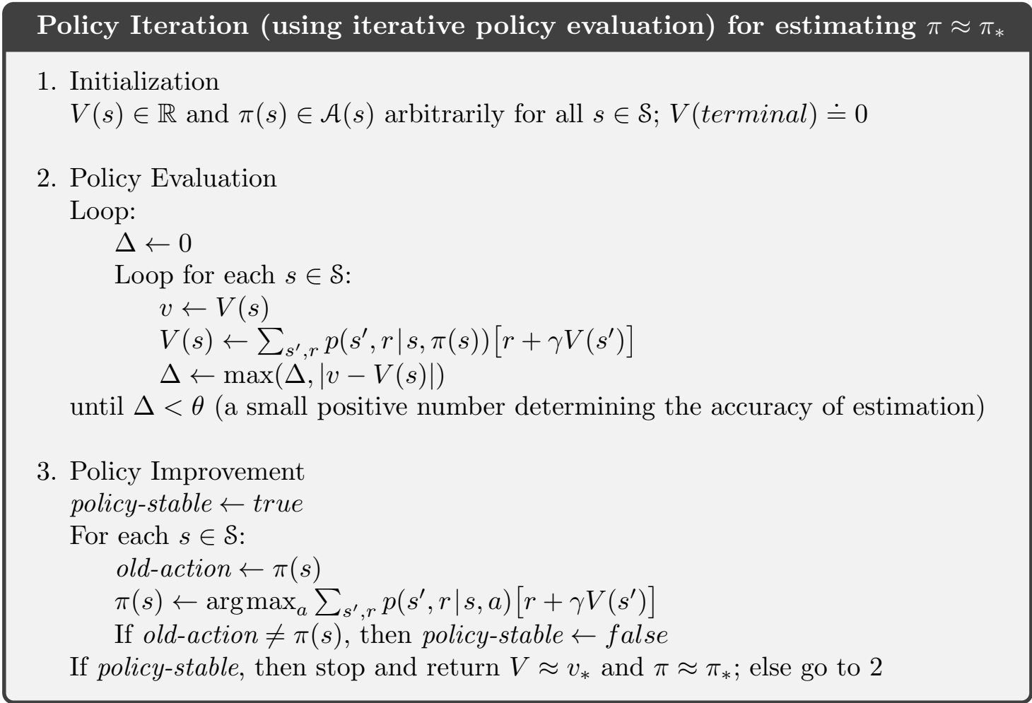 注意到上面的迭代其实是根据策略进行迭代的,也就是说选择一个初始的策略,然后进行贪心去逼近最优的算法,但这样的速度是非常慢的,所以可以利用最开始的哪个价值迭代的递推表达式,来直接进行价值迭代,其算法示意图如下:
